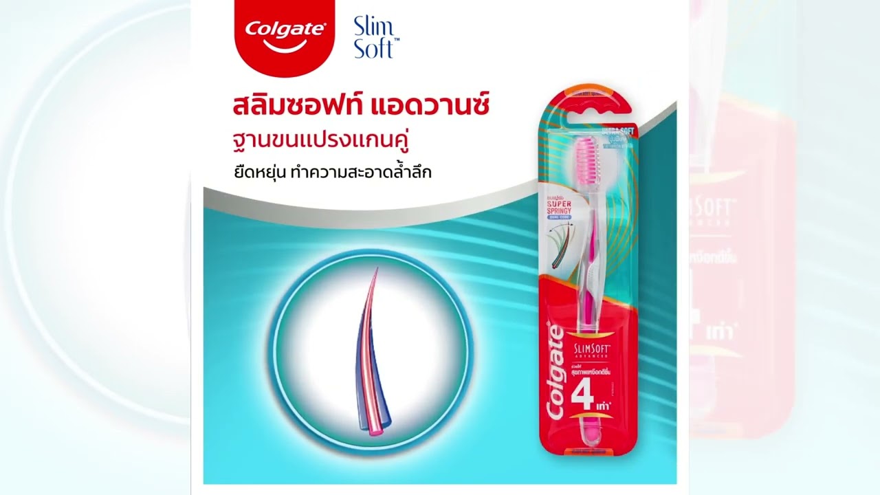 แปรงสีฟันคอลเกต สลิมซอฟท์ เฟล็กซ์คลีน นวัตกรรมขนเเปรงนุ่มมาโครโมเลคูล่า ยืดหยุ่นมากขึ้น 2 เท่า ช่วยดูแลเหงือกอย่างอ่อนโยน หัวเเปรงบางพิเศษที่สุด 0.3 เซนติเมตร เพื่อการทำความสะอาดบริเวณที่เข้าถึงยากเเละช่วยลดเเบคทีเรียในช่องปาก